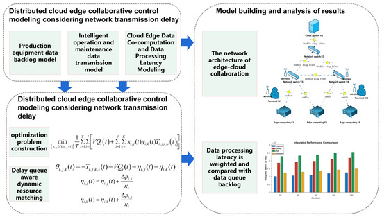 The rest of this paper is as follows: Section 2 provides a comprehensive overview of related works. Section 3 elaborates on the distributed cloud–edge collaborative control modeling with consideration of network transmission delay. Section 4 introduces the cloud–edge collaborative data processing optimization algorithm based on processing delay and backlog perception matching. In Section 5, the effectiveness of the proposed distributed cloud–edge collaborative scheduling algorithm (with network transmission delay constraints) is validated through simulation experiments and compared against three other algorithms. Section 6 concludes the entire work. The overall research content framework is shown in Figure 2.