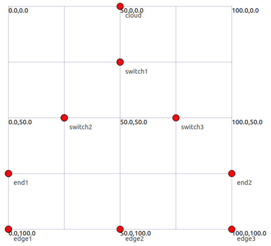 This paper builds a comprehensive network model, which includes a cloud system as the core hub. This is connected with three network switches, which are connected to build a high-availability internal network infrastructure. The model also includes three edge nodes, which are distributed in different geographical locations to provide services and data processing closer to users. In addition, two wireless nodes are integrated into the network to support the connection of mobile devices and sensors. The network architecture of edge–cloud collaboration is shown in Figure 4.