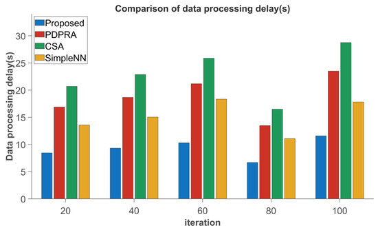 As verified by simulation, the proposed delay-aware distributed cloud-edge scheduling framework exhibits significant performance improvements in dynamic network environments. As shown in Figure 8 and Figure 9, the algorithm outperforms the traditional approaches (PDPRA, CSA, Simple NN) by reducing the data processing latency by 6.26–19.2%, and improving the queue backlog alleviation rate by 13.57–22.5%. This superiority stems from its unique integration of the following components: