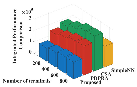Combining the results of queue backlog items, the total cost difference is shown in Equation (A17). The average value of the queue backlog is limited to , and increasing can further reduce the backlog. The difference between the delay term of the algorithm and the global optimal solution is , indicating that the algorithm has asymptotic optimality in delay optimization. By adjusting , the queue backlog and delay optimization can be balanced.