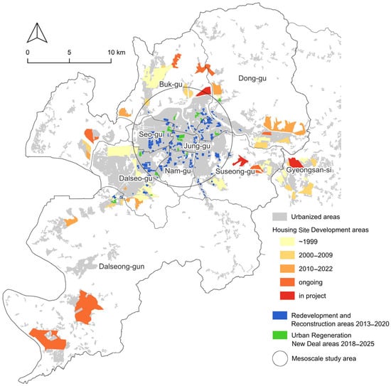 The first major expansion of Daegu occurred within its geographic bowl until the 1980s, corresponding to the mesoscale study area indicated in Figure 3. This expansion was based on the Land Readjustment (LR) procedure, characterized by small plot and individual or small collective housing. The second expansion consisted of satellite new towns in adjacent valleys following the Housing Site Development procedure [31,71]. The new town mainly consisted of dense apartment complexes. A detailed mapping of Daegu’s urban expansion is available in Supplementary Materials Figure S5. Housing Site Developments are mapped in Figure 3 [74]. Initially a response to explosive growth and overcrowding, these developments were later considered the primary cause of city center desertification [10,27]. In contrast to the expected national rebalancing, the recent development of Dong-gu Innovation City drew its population mainly from the surrounding districts, notably the depopulating inner city [93].