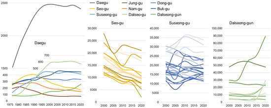 Figure 5 shows that Daegu’s population peaked in 2000, driven by the growth of peripheral districts, while central districts (Jung-gu, Nam-gu, Seo-gu) began shrinking as early as the 1980s [77,79]. The evolution at the neighborhood scale shows strong variations, with characteristic dips due to wholesale demolitions, followed by a rebound after project completion. Neighborhoods inside the same district experience different fates. In the industrial Seo-gu, redevelopments fail to remediate the fast depopulation and are mere upticks on a descending curve. In affluent Suseong-gu, redevelopment enables some areas to maintain or increase their population, while others continue to decline. Meanwhile, the remote greenfield developments of Dalseong-gun concentrate the population in a few development areas, leaving the rest of the rural district stagnant [78,79].