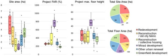 The housing urban plan for 2010–2020 [73] designated maintenance zones amounting to 9 km2, concentrated in the central city area, where they represent around 10% of the urban land (Figure 3). So-called ‘maintenance projects’ are divided between ‘redevelopment’, providing basic infrastructure provision in deprived areas, and ‘reconstruction’, targeting old low-rise districts or aging housing complexes with sound infrastructure. The inventory of ongoing collective housing developments released by the city [80] provides a good overview of the projects’ trend toward bigness (Figure 6). Greenfield developments make up 30% of the overall developed land area and only 20% of the total floor area, making the reuse of already urbanized land the dominant paradigm. Among this reused land, 40% escapes the monitoring of the maintenance plan, notably the mixed developments with a surface of non-housing over 10% in commercial urban zoning (Korean: chusangbokhab). Project sites are considerably large, varying from one to seven hectares, with an average of three hectares. The legal floor area ratio (FAR) typically falls within the (250–280)% range, consistent with the zoning regulations for residential areas [73]. However, some projects in commercial zones reach more than 800%, reflecting extremely high-density development. The floor number averages 27, with peaks above 40 illustrating the radical verticalization of the city.