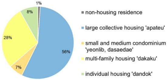 Large-scale apartment complexes now dominate Daegu’s housing market, accounting for 56% of the city’s housing stock as of 2017 (Figure 7). Small-scale tenements (Korean: dakaku) constitute the main alternative, while mid-scale condominiums (Korean: dasaedae and yeonlib) and individual housing represent only a fraction of the stock [96].
