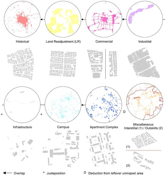 - Land Readjustment: Fine gridiron patterns with low-rise habitat resulting from LR developments between 1940 and 1983, mapped using the Daegu Land Readjustment White Book [104].
