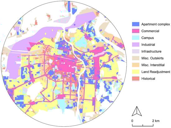 - Campus: Schools, army bases, government, and sports institutions over 10,000 m2 adopting a loose and airy building pattern, mapped using legal zoning, GIS data, and observation.
