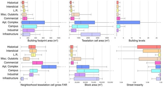 Boxplot of selected morphometric characters for buildings in the defined morphogenetic regions and their associated cell, blocks, and streets. Characters are defined in Fleischman’s Numerical Taxonomy study [64].