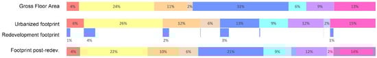 Fine-grained fabrics represent the largest footprint in the study area, occupying 44% of the urbanized surface, with LR tissues alone representing 26% (Figure 11). Apartment Complex tissues provide 31% of the total gross floor area for only 13% of the urbanized surface. With 11% of the study area engaged in redevelopment, the importance of apartment complexes will grow significantly in the coming years. Redevelopments target all fine-grained tissues rather indiscriminately: historical 22%, interstitial 17%, LR 15%. If all scheduled redevelopments were to be completed, the footprint of apartment complexes would almost double, reaching 21%. However, the fine-grained fabrics would remain the dominant land pattern, with a combined 36% footprint.
