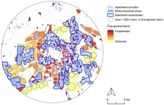 The observation of ongoing changes comprised the identification of apartment complex superclusters, defined as regions buffered by 50 m that will exceed 50,000 m2 once all ongoing projects are completed. Conversely, the fragmentation of urban fabric was assessed using region size moderated by its rectangularity [86]. Holes under 20,000 m2 were ignored to identify coherent areas over 400 m in diameter, including even large schools in this analysis.