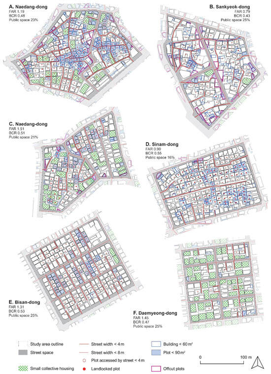 - Gohaud, E.; Schuetze, T. Assessing urban grain fineness and density potential—A case study for Korean urban regeneration. In Proceedings of the XVIII International Seminar on Urban Form “Urban Form and the Sustainable and Prosperous City”, Glasgow, UK, 29 June–3 July 2021. [Google Scholar]