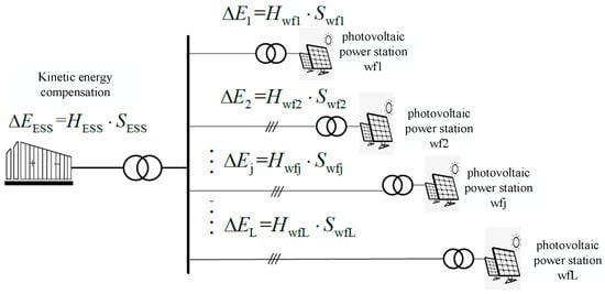 Hwfj, Swfj, and Ej in the diagram represent the virtual inertia, rated capacity, and kinetic energy weakening of the photovoltaic power station j (j = 1, 2…L), respectively; ΔEESS, HESS, and SESS are the compensation kinetic energy, virtual inertia, and rated capacity of shared energy storage, respectively.