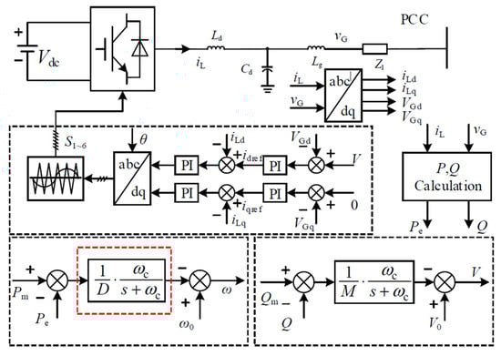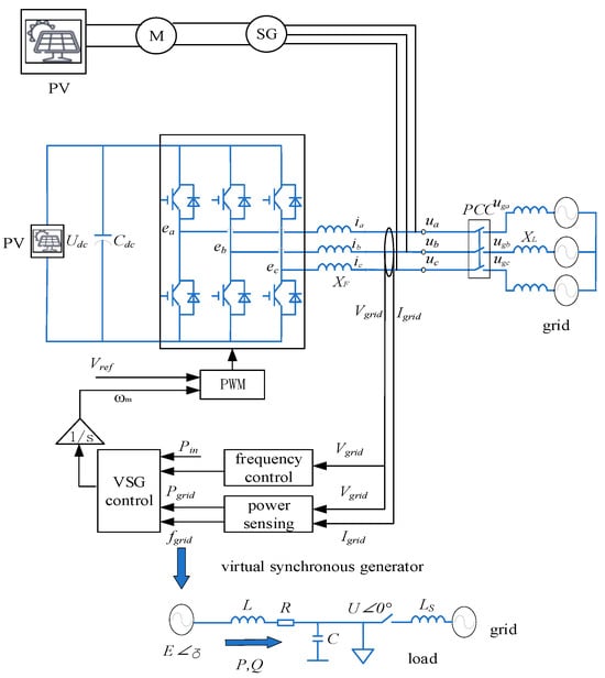 The control of an AC-integrated photovoltaic power station with an MW-level synchronous machine and a virtual synchronous control inverter is shown in Figure 2. The DC power in the photovoltaic power station drives the MW-level synchronous generator to generate electricity. In this control block diagram, distributed renewable energy generation is connected to the main grid through an inverter controlled by virtual synchronization.