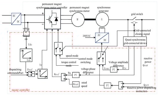 The DC motor controller in the photovoltaic station includes a speed control mode and torque control mode. According to the operation mode command of the total controller, the speed closed-loop and torque closed-loop control of the permanent magnet synchronous motor are realized, respectively. The AC/DC rectifier can realize the controllable rectification from AC to DC. According to the voltage command of the main controller, the excitation voltage of the synchronous generator is quickly adjusted to change the excitation current. The quasi-synchronous grid-connected device is used to detect the three-phase voltage at the motor end, as well as the three-phase voltage and the three-phase current at the grid side. The amplitude difference, phase difference, frequency difference, and reactive power of the three-phase voltage between the motor end and the grid side are fed back. Once the amplitude difference, phase difference, and frequency difference meet the requirements of grid connection, we send the grid-connected closing command to the grid-connected cabinet to achieve no impact on the current grid connection. The total controller is divided into two stages, namely pre-grid control and post-grid control.