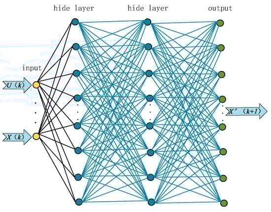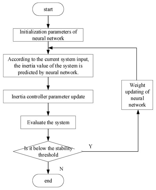 The neural network’s primary objective focuses on maximizing prediction precision for subsequent states. During operation, randomized control vectors are introduced into the model while quantifying the resultant state values. As shown in Figure 8, the neural network input includes a state vector and a control vector, and its output is the estimation of the next state. We constructed a neural network prediction update method, as shown in Figure 9. The neural network prediction process of the inertia parameters of photovoltaic power station is as follows.