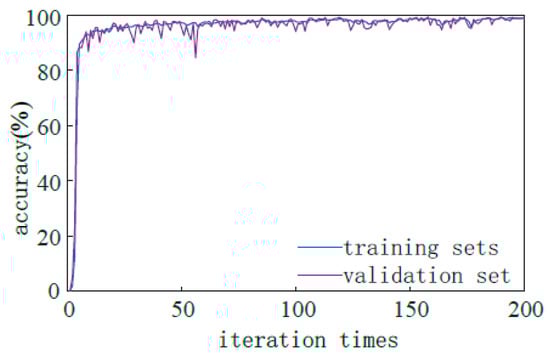 The number of model iterations is set to 200 times, and the network is initialized before training. The learning rate is 0.0001 and the batch size is 256. Figure 11 shows how the accuracy of the training set and the test set changes with the number of iterations. The final accuracy of the training set and the verification set is 99.49% and 99.09%, respectively.