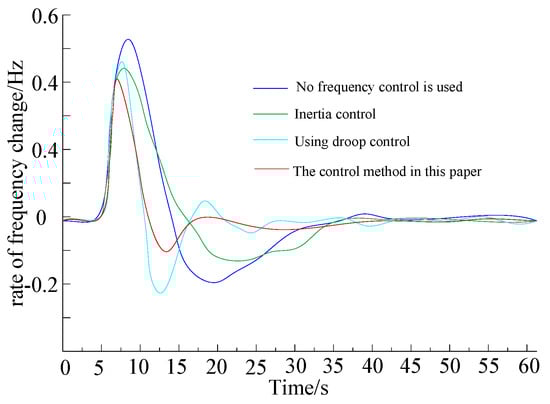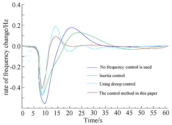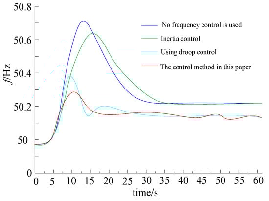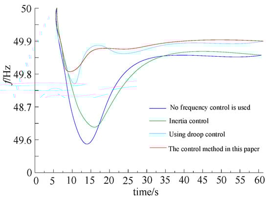 After the system is stable, a sudden increase of 80 MW and a sudden decrease of 800 W are also simulated and compared. The corresponding simulation results are shown in Figure 12 and Figure 13 and Figure 14 and Figure 15, respectively. Among them, Figure 12 and Figure 13 are the comparison of the frequency characteristics under different control modes (in the case of a sudden load increase), while Figure 14 and Figure 15 are the comparison of the frequency characteristics under different control modes (in the case of a sudden load decrease).