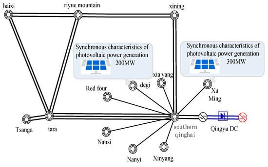 In order to verify the effectiveness of the proposed method in the sending end system for transient overvoltage control and improving the system support capability, the inertia control of multi-AC collection in the process of the grid connection of a photovoltaic station in Northwest China is verified. The grid-connected and outgoing system of the photovoltaic station is shown in Figure 16. When the sending channel of the sending end system fails, the regulation ability of the grid-connected photovoltaic power generation system with synchronous characteristics can be used to absorb the excess reactive power of the system and suppress the overvoltage.