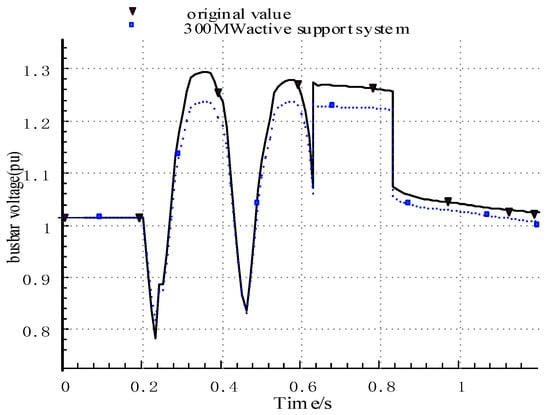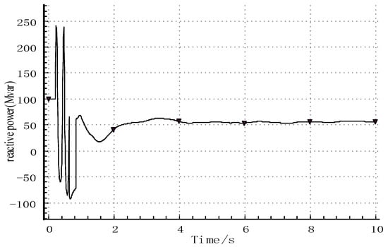 Under the typical operation mode, the transmission power of Qingyu is 4 million kilowatts. When the Qingyu DC is blocked after three consecutive commutation failures, the transient voltage rise is up to 0.28 p.u. When the DC continuous commutation of the sending system fails, the bus voltage of the blocking fault is shown in Figure 17. By using the control method based on renewable energy synchronous units, the active and reactive power output of the active support system of the photovoltaic station is shown in Figure 18 and Figure 19.