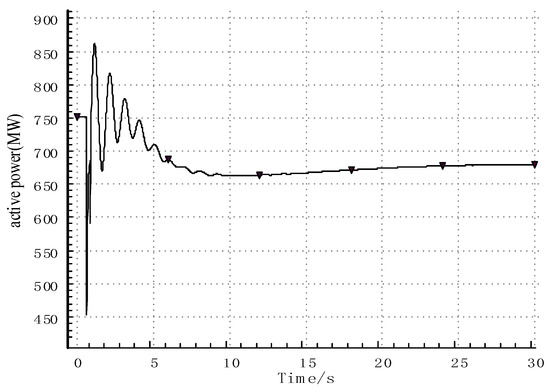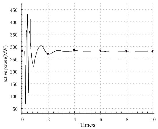 When the Qingyu DC transmission power is 4 million kilowatts, the maximum frequency deviation of the system reaches 0.221 Hz when the Qingyu DC bipolar blocking fault occurs. The 800 MW photovoltaic power station at Xuming in the area near the DC is transformed into a synchronous photovoltaic power generation grid-connected system. The system frequency after the fault is shown in Figure 20, and the active power of the synchronous photovoltaic power generation grid-connected system is shown in Figure 21.