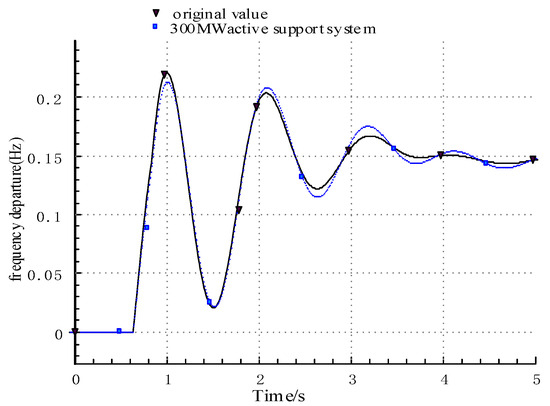 Compared with the original photovoltaic grid-connected control, the 800 MW photovoltaic power station is transformed into a synchronous photovoltaic power generation grid-connected system. After the fault, with the increase in the system frequency, the synchronous photovoltaic power generation grid-connected system participates in the primary frequency modulation control. The maximum frequency deviation of the system is reduced from 0.221 Hz to 0.213 Hz.