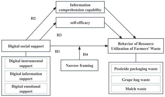 Farmers’ behaviors are affected by the external environment and their own characteristics; self-efficacy refers to an individual’s perception or belief of whether he or she can adopt adaptive behaviors in the face of challenges in the environment, and studies have shown that it positively affects farmers’ green production behaviors [29]. It has also been shown that social support is effective in increasing individual self-efficacy perceptions, which in turn significantly enhances entrepreneurial behavior [30]. As far as digital social support is concerned, the information of waste resource utilization provided by digital information support can increase farmers’ relevant knowledge, skills, and experience, enhance their confidence and self-efficacy, and make farmers more inclined to undertake challenging environmental protection tasks, thus promoting farmers’ participation in waste resource utilization in the planting industry. Digital emotional support can encourage farmers, make them truly feel that their efforts and behaviors for environmental friendliness are recognized, enhance their self-efficacy, and further promote farmers’ participation in waste resource utilization. Based on this, the following hypothesis is put forward.