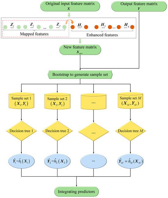 Compared to the original sample, the newly mapped and enhanced sample matrix better represents the nonlinear relationships between input features and output features. Consequently, the BLS successfully uncovers the fundamental complex relationships of the original features, improving the prediction performance of the RF. Figure 1 shows the framework for the proposed BRF model. For the m-th sample set generated by the bootstrap method, let be the input and output feature matrices selected randomly from and Y, be the associated prediction results, and the decision function, .