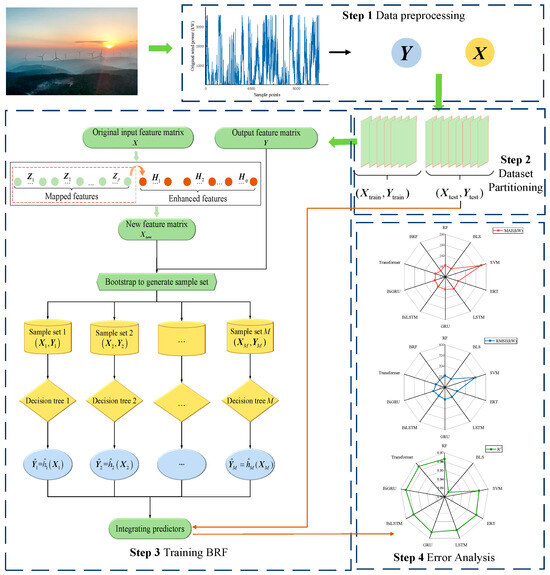 The BRF model is applied to the prediction of wind power, as illustrated in Figure 2. Specifically, the wind power prediction process is primarily divided into the following four steps.