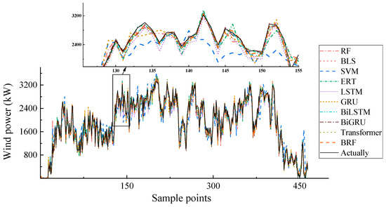 Due to the limited characteristics of wind power data, traditional machine learning models such as SVM, LSTM, and GRU struggle to adequately capture the nonlinear features, resulting in suboptimal forecasting performance. The BLS model enhances and maps’ existing features, effectively representing the nonlinear characteristics of the original wind power series. In contrast, the RF model randomly selects features and employs multiple decision trees in parallel, increasing operational efficiency. Among BRF, BLS, and RF, the BRF outperforms the other two models by 0.22% and 0.44% in on Dataset 1. In Dataset 2, the BRF shows improvements of 0.40% and 0.65% over BLS and RF, respectively. Consequently, the BRF achieves superior predictive performance.