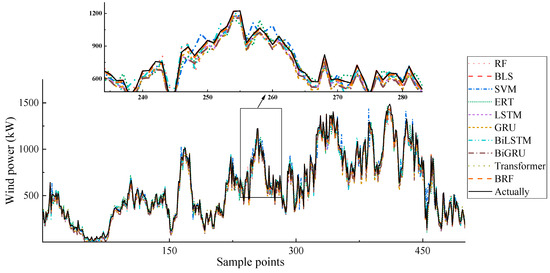 For the aforementioned 10 models, Table 3 and Table 4 present three evaluation metrics on two datasets. As shown in Table 3, the MAE, RMSE, and R2 values of the proposed model are 134.3293 kW, 241.2171 kW, and 0.9650 on the first dataset, representing improvements of at least 3.43%, 0.94%, and 0.22% over the other 9 models. Table 4 further shows that BRF retains the best predictive accuracy on Dataset 2, with MAE, RMSE, and showing improvements of at least 3.80%, 3.34%, and 0.44%.