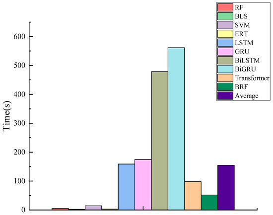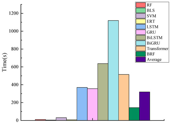 By observing the two tables and figures, it can be seen that both the BLS and RF models significantly enhance computational efficiency in comparison to deep learning models (i.e., GRU, LSTM, BiGRU, BiLSTM, and Transformer). This evidence implies that the architectures of BLS and RF can effectively reduce the time complexity of the models.