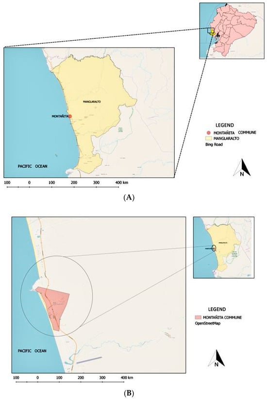 The geographical location of Montañita, Ecuador. (A) This figure shows the position of Montañita within Manglaralto and its placement on the coast of Ecuador. (B) This figure shows the territory of Montañita in relation to Manglaralto and its location on the coast of Ecuador.