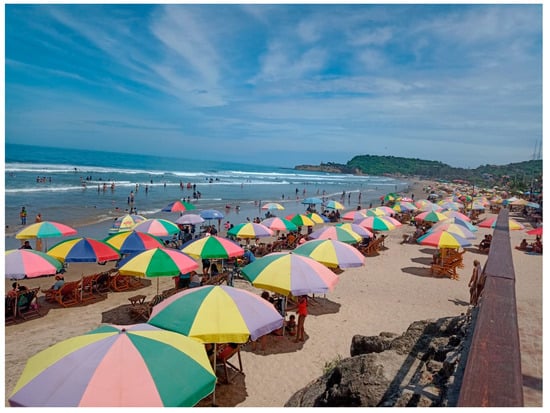 Tourism is the primary source of income for Montañita’s community, with many locals working in hotels, restaurants, surf schools, clothing stores, and nightlife-related businesses. The town’s reputation has been further strengthened by international events such as the Ecuador REEF CLASSIC and the ISA MASTER’S World Championship in 2013, along with other signature activities, positioning Montañita as a hub for coastal and marine tourism that extends beyond just sun and beach experiences. (Figure 1A,B and Figure 2).