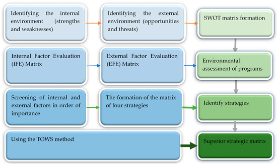 Although SWOT analysis helps gain a clear understanding of both the internal and external environments of a phenomenon and identifies the strategic space or strategy of the topic under study, this tool does not provide any direct suggestions for improving or developing the current situation. One of the most important stages of analyzing the internal and external space of any phenomenon or subject is presenting solutions for improving and developing the current status. The TOWS matrix is a tool designed for this purpose, and it typically follows the SWOT analysis stage. The TOWS matrix is based on the assumption that, in a specific organization or subject, strengths and opportunities should be maximized, while weaknesses and threats should be minimized. This tool helps us define and present appropriate strategies in four different categories (SO, ST, WO, WT), depending on the strategic space of the subject under examination [51,52].