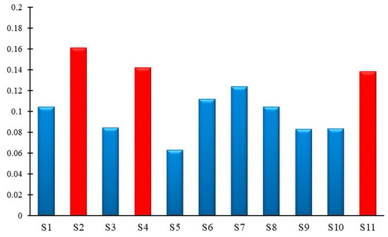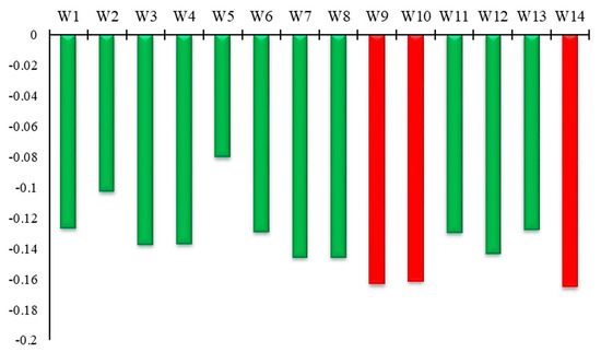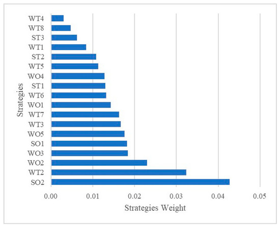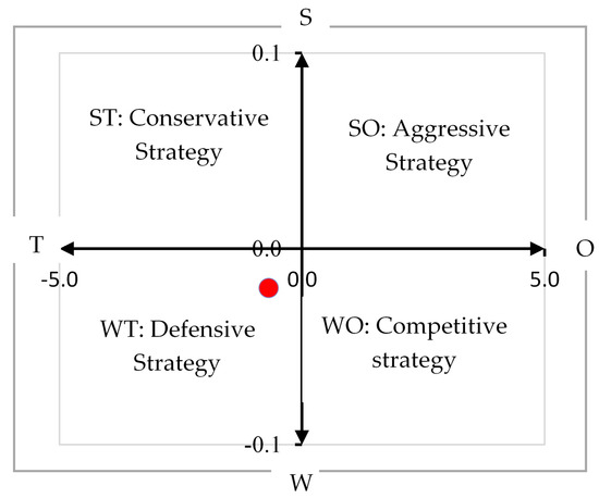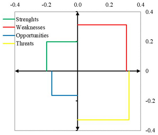 A comparison of the weights for strengths, weaknesses, opportunities, and threats revealed that threats had the highest normalized weight (0.328), while opportunities had the lowest (0.165) (Table 4 and Figure 7). When comparing the coefficients of the internal (strengths and weaknesses) and external (opportunities and threats) factors, both internal and external environments were found to have negative values, with normalized coefficients of −0.694 and −0.993, respectively. This indicates that weaknesses dominate the internal environment, while threats prevail in the external environment. Additionally, the overall normalized weight of internal factors (0.508) was almost equal to that of external factors (0.492). However, a comparison of positive factors (strengths and opportunities) and risk-prone factors (weaknesses and threats) showed that the risk-prone environment (0.638) significantly outweighs the positive environment (0.362) (Table 4).
