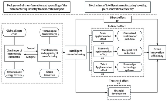 The analytical framework of this study is shown in Figure 1. Given the dual challenges of the current climate and energy crisis, this study focuses on the urgent need for the transformation and upgrading of the manufacturing industry and provides theoretical support and practical paths for the construction of a sustainable urban development system by systematically analyzing the direct role, indirect conduction and threshold characteristics of intelligent manufacturing on the efficiency of urban green innovation.