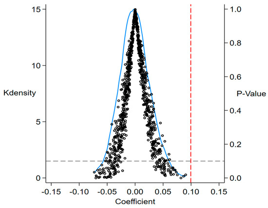 Table 5 lists the estimated results of the impact of intelligent manufacturing on the GIE of cities. In the benchmark regression model, this paper uses a stepwise regression approach. In column (1), the model contains only policy variables and does not include city and individual control effects. The results show that the coefficient of DID is 0.148 and is significant at the 1% level, implying that intelligent manufacturing can significantly contribute to the growth of GIE in the pilot cities. Column (2) adds time-fixed effects and city-level control variables to column (1), and the estimated coefficients are still significantly positive at the 1% level, but the values of the regression coefficients decrease. Column (3) adds a series of control variables that may affect the efficiency of green innovation in cities, and column (4) adds time-fixed effects and city-fixed effects to (3). In terms of economic significance, taking the fourth column as an example, the implementation of the MIC2025 policy led to a 10% increase in the GIE of the city. The empirical results support Hypothesis 1. The literature empirically analyses the data of China’s A-share listed manufacturing enterprises on the basis of data from 2008–2021 by constructing a double-difference method and concludes that intelligent manufacturing has a significant role in promoting the green innovation of enterprises [40], which is corroborated by the findings of this paper.