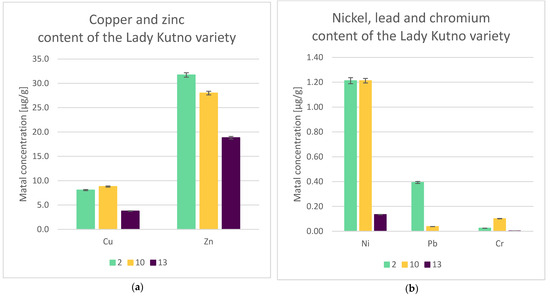 Copper, zinc (a), nickel, lead and chromium (b) contents in the Lady Kutno variety with relevant standard deviations (n = 5).