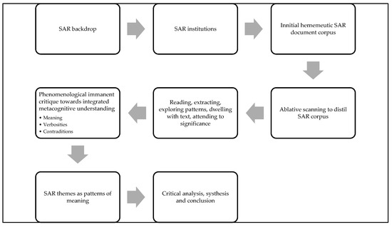 The research operationalized hermeneutic phenomenology using ablative, reflexive thematic analysis (ARTA)—a parsimonious approach to interpret relevant texts without formal coding [31]. In a recent article, Braun and Clarke warn against Thematic Reflexive Analysis incongruence by adopting procedural (checklist) quality practices [32]. Rather than worrying about subjectivity it must be managed. Ablation (Latin: ablātĭo) facilitates the conceptualization of themes as patterns of subjective meaning central to a qualitative approach. Ablation involved an initial scanning of the SAR backdrop to identify key players in the field and generate a tightly focused corpus of their recent SAR documentation. Procedurally, the investigation followed the sequence, illustrated in Figure 3. First, the research reviewed the SAR backdrop to identify key global players engaged in the SAR debate or practice. Among the entities fulfilling these criteria were the United Nations Environment Programmes (UNEP, UNEP-FI), EU, GRI, SASB, and IFRS. From these institutions, this study sourced recent literature (reports, public documents, academic articles, published reports, and brochures or web pages)—the SAR corpus. The research adopted Maxwell’s pragmatic literature approach and employed a ‘tools’ rather than ‘foundation’ metaphor to isolate relevant SAR sources [33]. To isolate papers with a ‘thematic fit’, marginal texts with peripheral narratives were progressively removed from the retained corpus to leave a manageable sample of relatively recent (>2020) published works [34] (p. 99).