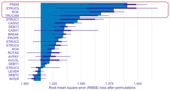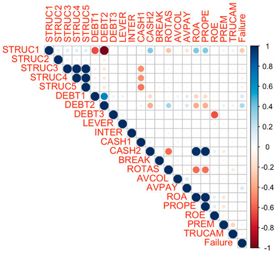 To identify high correlations among predictors and the response variable, we created a correlation plot or correlogram (Figure 1). The plot reveals that only a small number of variables exhibit strong correlations, highlighted by larger points and more intense colors. A correlogram visually represents the correlation matrix, where each coefficient is depicted using color and point size based on its value. The analysis shows some correlations among variables related to structure, indebtedness, and profitability. However, the XGBoost machine learning algorithm effectively handles correlated independent variables, as supported by previous studies [51,52,53]: