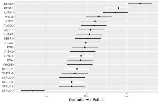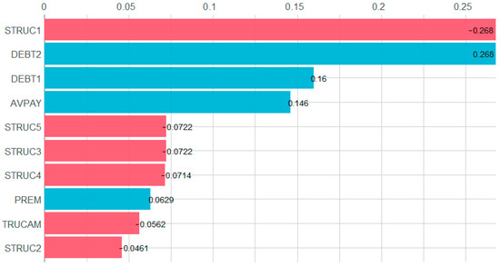 Additionally, Figure 2 illustrates the correlations (and 95% confidence intervals) between all predictors or variables and the propensity to fail (Failure, the term used for the financial strength indicator VADIS 2PBB) in the dataset. This analysis suggests that Failure has a relatively positive correlation with certain debt-related variables and the variable AVPAY (average payment period in days), indicating that increases in these variables are associated with a higher likelihood of failure. Conversely, there is a noticeable negative correlation with variables linked to financial structure, particularly with the variable STRUC1 (solvency ratio), suggesting that decreases in these variables are associated with an increased propensity to fail. These findings are further reflected in Figure 3, which highlights the ten independent variables most strongly correlated with the dependent variable, propensity to fail—negative correlations are shown in red, while positive correlations are depicted in blue.