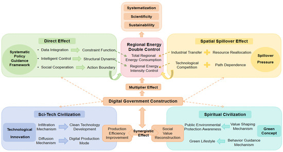 This study aims to elucidate the mechanisms through which digital government construction influences regional dual control of energy consumption (encompassing both the total volume and intensity of energy use), with a particular emphasis on exploring its indirect effects mediated by the synergistic advancement of technological and spiritual civilizations. Drawing on provincial panel data from China, we establish a nested framework that integrates spatial difference-in-differences models with double machine learning models to systematically dissect the transmission pathway linking digital government construction, the synergy between technological and spiritual civilizations, and the dual control of energy consumption. Our findings indicate the following: (1) Digital government construction significantly enhances the dual control of regional total energy consumption and energy intensity through policy coordination and optimized resource allocation. (2) While the progression of technological civilization plays a notable intermediary role in reducing energy intensity, its impact on total energy consumption is constrained by the “Jevons paradox”. (3) Advancements in spiritual civilization concurrently promote the alleviation of both total energy consumption and energy intensity by reshaping social consensus and behavioral norms. (4) The synergistic effects of technological and spiritual civilizations further amplify the efficacy of the dual control of energy consumption, although digital government construction exhibits a pronounced spatial polarization effect on energy intensity in neighboring regions. The theoretical contributions of this study are as follows: Firstly, it proposes the governance paradigm of digital government as a “technology–culture” collaborative hub, breaking through the binary opposition between technological determinism and institutional embeddedness. Secondly, it constructs a “feasible ability” expansion model to reveal the complementary mechanism between scientific and technological civilization (technology acquisition ability) and spiritual civilization (value selection ability). Thirdly, the policy black box is deconstructed through methodological innovation and provides a systematic path for emerging economies to solve the “efficiency–equity” dilemma of energy governance.
