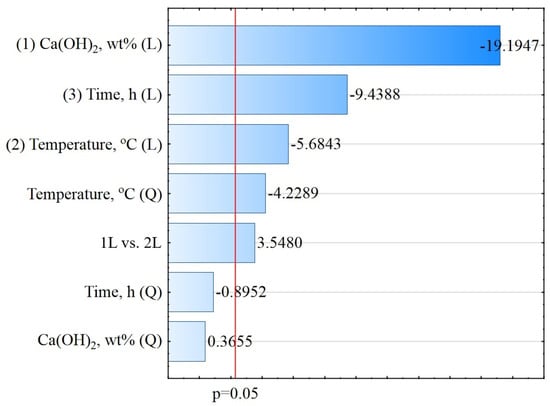 The ANOVA results after excluding the statistically insignificant linear (L) interaction effects of the Ca(OH)2 concentration relative to time (p = 0.5386) and temperature relative to time (p = 0.1010) are presented in Table 2. The calculated values of the coefficients R2 (98%) and Radj.2 (97%) suggest that the determined regression plane exhibited a good fit to the experimental data. The statistical analysis revealed four statistically significant parameters, i.e., the Ca(OH)2 concentration (L), temperature (L), temperature (Q), time (L), and one interaction of Ca(OH)2 concentration (L) relative to temperature (L). The Ca(OH)2 concentrations (Q) and time (Q) were statistically insignificant, with p values higher than 0.05. The results of the ANOVA revealed that the mean squared error (MS) was 0.0928.