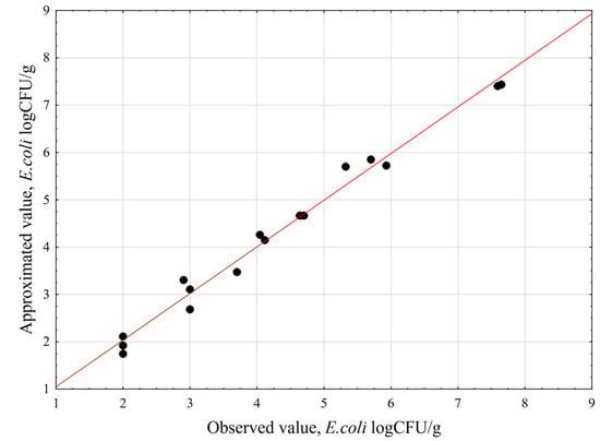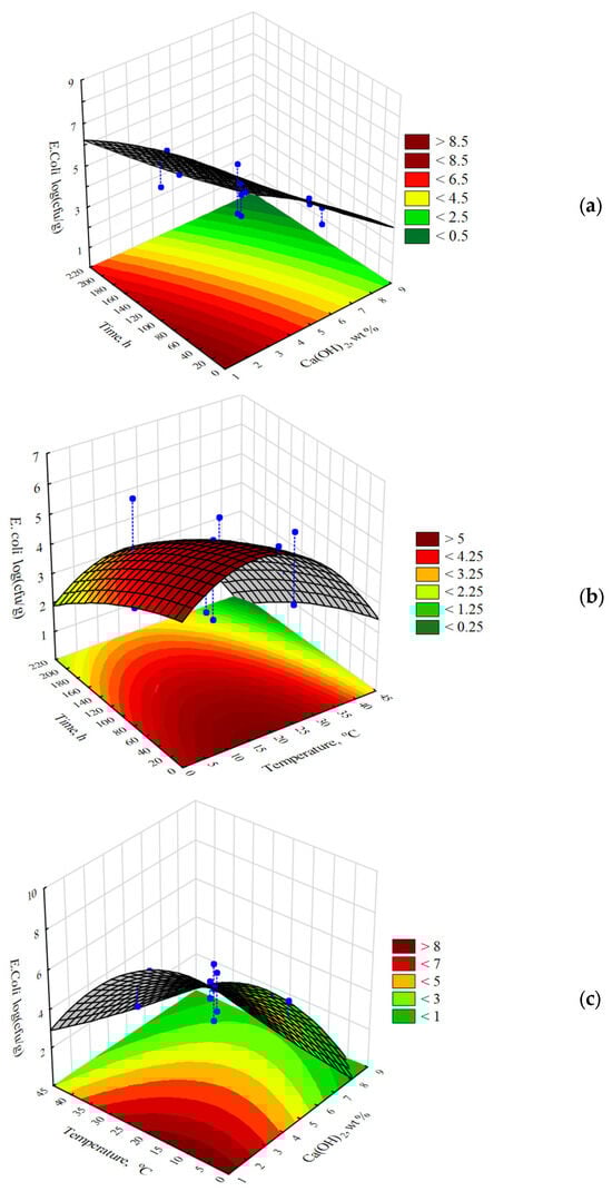 Figure 2 shows that all the points denoting the experimental data are close to the red line, which represents the approximated values. This indicates a good fit between the developed model and the obtained experimental results. The response surface plots describing the influence of the Ca(OH)2 concentration, process temperature, and contact time on the number of E. coli bacteria are presented in Figure 3. The shapes of the prepared 3D plots revealed the influence of the discussed factors on the number of pathogens identified in the poultry manure samples.