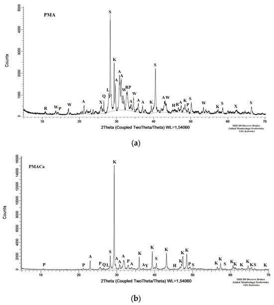 X-ray diffractogram of poultry manure ash: (a) PMA sample and (b) PMACa sample. Explanations of the crystalline phase abbreviations are provided in Table 4.