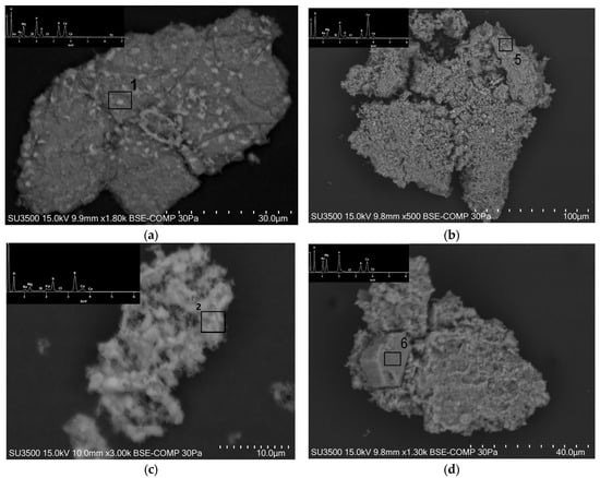 Images of the selected ash grains: (a,c) sample PMA; (b,d) sample PMACa. Explanation: 1, 2, 5 and 6 are numbers of the microareas subjected to analysis, marked with a black square. The chemical compositions of these microareas are presented in Table 6.