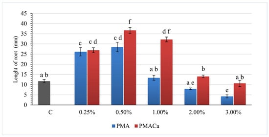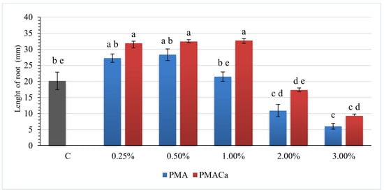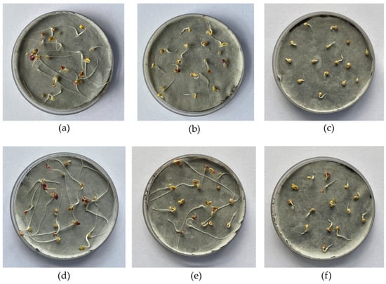 The phytotoxicity test was carried out according to the standard method ISO 18763: 2016 []. The obtained samples of poultry manure ash (PMA) and poultry manure ash with calcium hydroxide (PMACa) were tested as fertilizers for contaminated soils (S1 and S2) at doses of 0.25%, 0.50%, 1.00%, 2.00%, and 3.00%, respectively. A 50.000 ± 0.001 g blend of soil and poultry manure ash was placed in a sterile Petri dish (90 mm diameter) and mixed with distilled water. Afterwards, 15 seeds of white mustard (Sinapis alba L.) were placed on filter paper (grade 292, Munktell, Ahlstrom Munksjö, Finland) close to the lid. All the samples were prepared in triplicate. Contaminated soil without ash was used as the control sample. The test plates with the seeds were incubated for 72 h at 25 ± 1 °C, and the length of the Sinapis alba roots was measured after incubation.