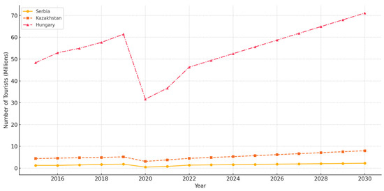 Figure 2 presents the projected number of tourists for Serbia, Kazakhstan, and Hungary during the period from 2015 to 2030. Hungary shows continuous growth, particularly after recovering from the decline caused by the 2020 pandemic. Kazakhstan demonstrates stable growth with minor fluctuations, while Serbia records the lowest number of tourists throughout the entire period, with slow but consistent growth.