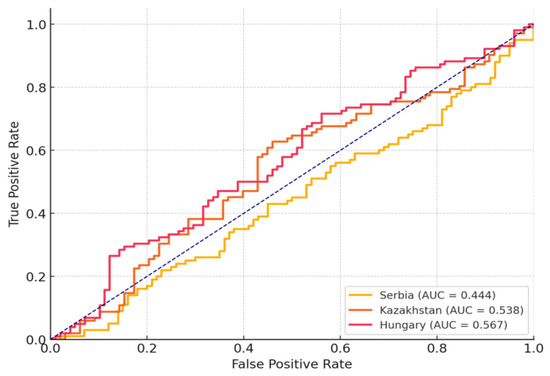 The estimated models were also tested for multicollinearity using the VIF test [96], ensuring values below the recommended threshold of 5, indicating no multicollinearity within the constructs (SRB: VIF ≤ 3.012, KAZ: VIF ≤ 3.008, HUN: VIF ≤ 3.014). Fit indices demonstrated satisfactory values for all three countries, including RMSEA, CFI, SRMR, and NFI [97]. The values for Serbia included RMSEA (0.046), CFI (0.961), SRMR (0.034), and NFI (0.932). For Kazakhstan, the obtained values were RMSEA (0.048), CFI (0.957), SRMR (0.036), and NFI (0.930). The values for Hungary were RMSEA (0.045), CFI (0.964), SRMR (0.033), and NFI (0.936). All these values are within acceptable limits, indicating a good model fit for each analyzed country. The coefficients of determination (R2) demonstrated adequate explanatory power of the dependent variable in all models. The values for Serbia (R2 = 0.672), Kazakhstan (R2 = 0.650), and Hungary (R2 = 0.676) indicate a satisfactory level of model explanation [98]. Additionally, the Random Forest algorithm was employed, and regression was used due to its ability to reduce variance and increase prediction accuracy [99]. This algorithm consists of multiple independent decision trees (n = 100), which together make the final decision through majority voting, thus achieving greater resilience against model overfitting. The data were previously normalized using the StandardScaler method, which allowed for scaling all variables to a standardized scale [100,101]. The model evaluation was performed using the Scikit-Learn library in Python 3.11 (sklearn), which provides a straightforward implementation and validation of various machine learning algorithms. For visualization of performance, the Matplotlib 3.7.x library was used, while the results of ROC analysis were created using the roc_curve and auc functions from the sklearn.metrics module. The significance of different construct factors in prediction was determined based on the Feature Importance functionality within the Random Forest model, allowing for the identification of the most influential variables in the prediction process. The model was further validated using a confusion matrix to determine prediction accuracy for all classes. For a more detailed analysis and prediction of factors influencing support for tourism development, modern machine learning algorithms were applied, including PCA, XGBoost, and K-means clustering. These algorithms enable the identification of key variables and the grouping of similar responses, and allow for a more detailed understanding of the interdependencies between constructs [102].
