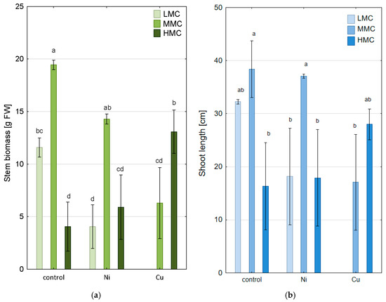 Stem biomass (a) and length (b) of P. nigra L. × P. maximowiczii in experimental variants (mean ±SE; significant differences between means were indicated with different lettering according to a post hoc Tukey’s test following the two-way ANOVA for fixed ‘soil moisture × treatment’ analysis at α = 95% (LMC—low moisture content, MMC—medium moisture content, HMC—high moisture content).