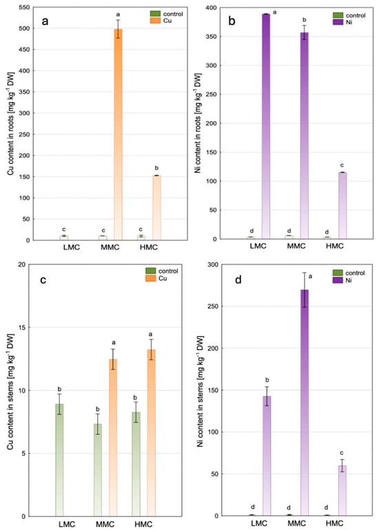 The content of Cu (a,c) and Ni (b,d) in roots and stems of P. nigra L. × P. maximowiczii in experimental variants (mean ± SE; significant differences between means were indicated with different lettering according to a post hoc Tukey’s test following the two-way ANOVA for fixed ‘soil moisture × treatment’ analysis at α = 95% (LMC—low moisture content, MMC—medium moisture content, HMC—high moisture content).
